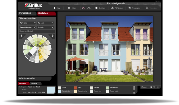 Nutzen Sie den Farbdesigner um Boden-, Wand-, und Deckenflächen ganz nach Ihrem Geschmack zu gestalten.